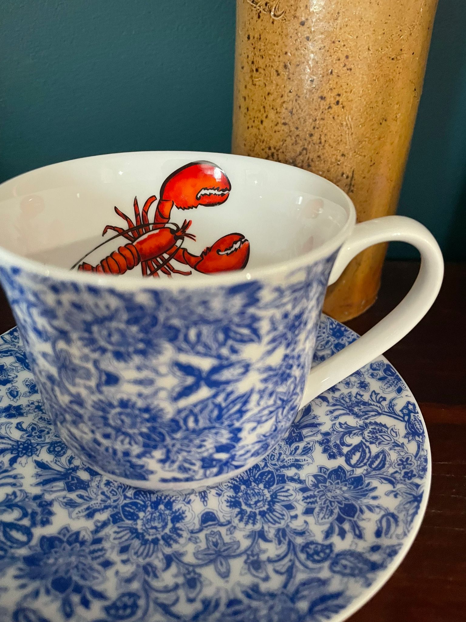Fine Bone China Tea Cup & Saucer, with a hand drawn Bali exterior and cheekily hiding Lobster design inside.